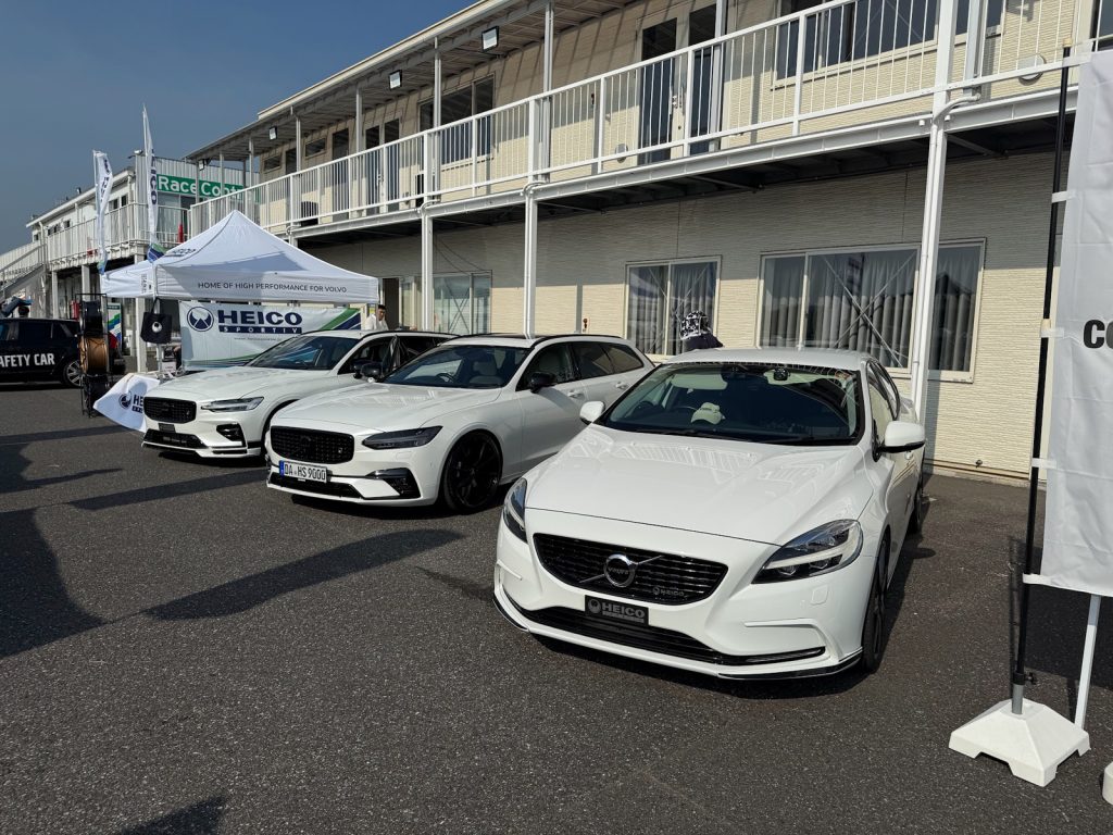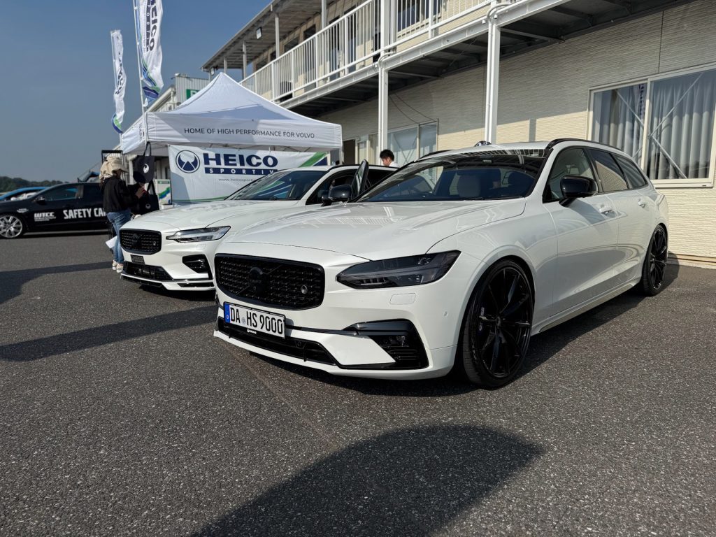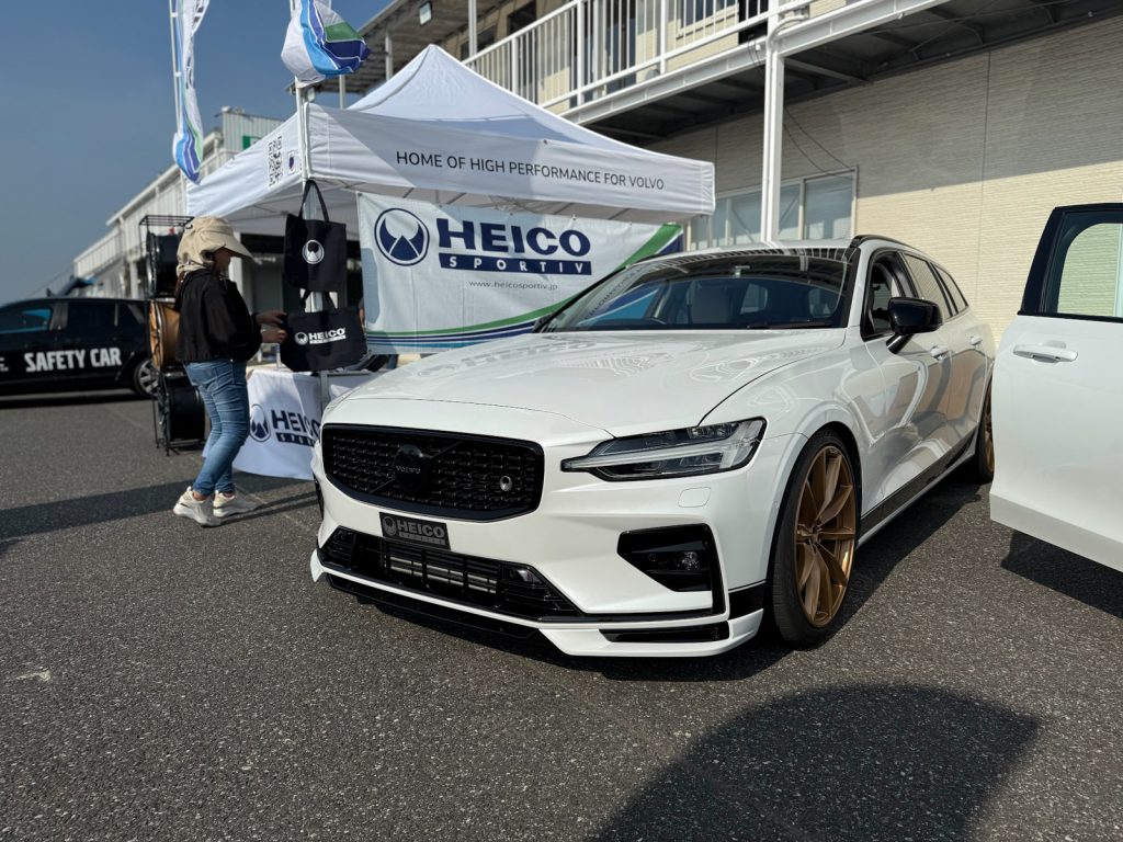 左奥には、HEICO SPORTIV JAPAN店長のデモカー、ZB型ボルボV60 T5 モメンタムをベースとした