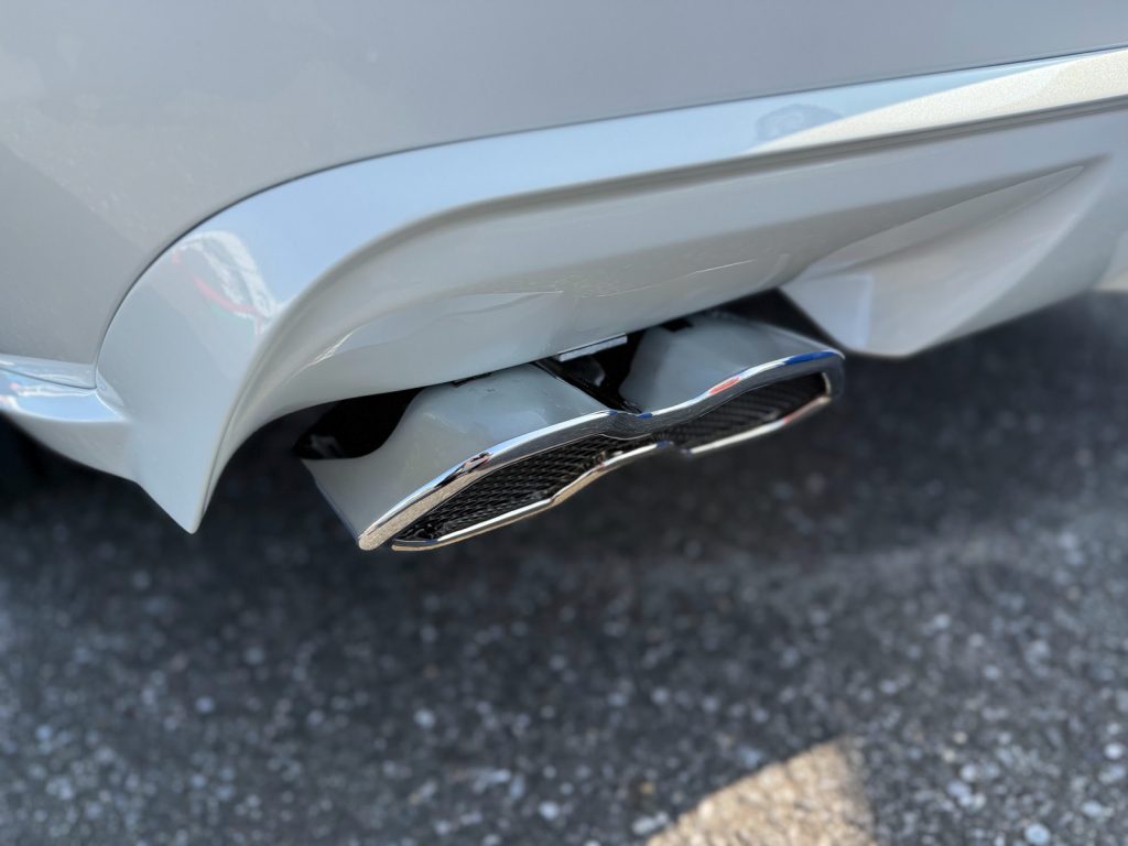 純正のマフラーは下向きになっているため、安価なカスタマイズのMENUとして今回はマフラーカッターをエアロパーツに装着しての、ダミーパーツとしているとの事でした。