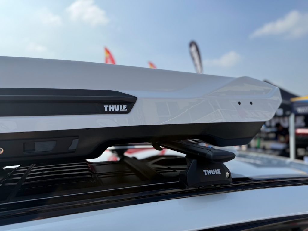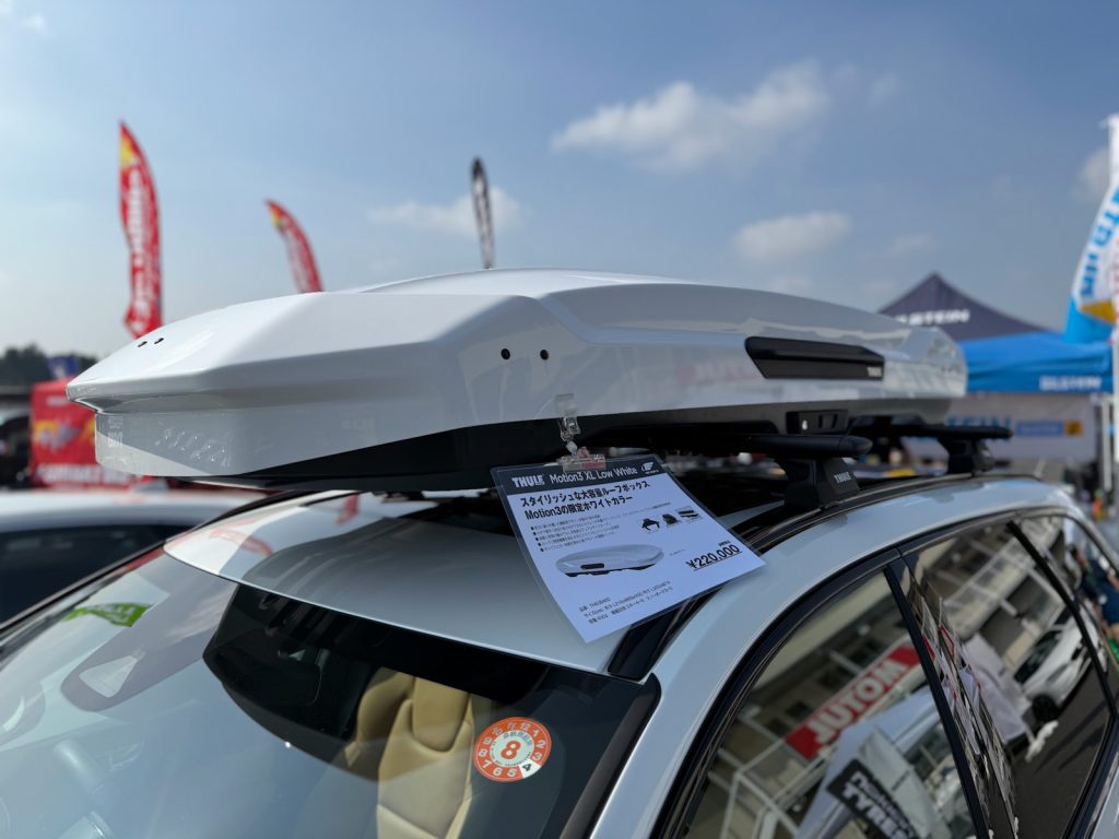 ホワイトカラーのルーフボックスを特別に装着していただき、THULEデモカーとして展示していただきました。