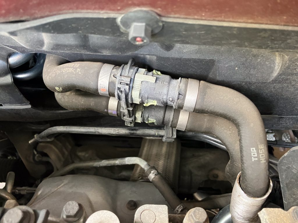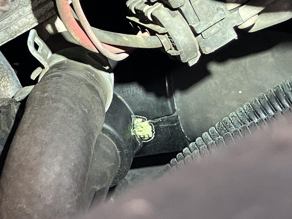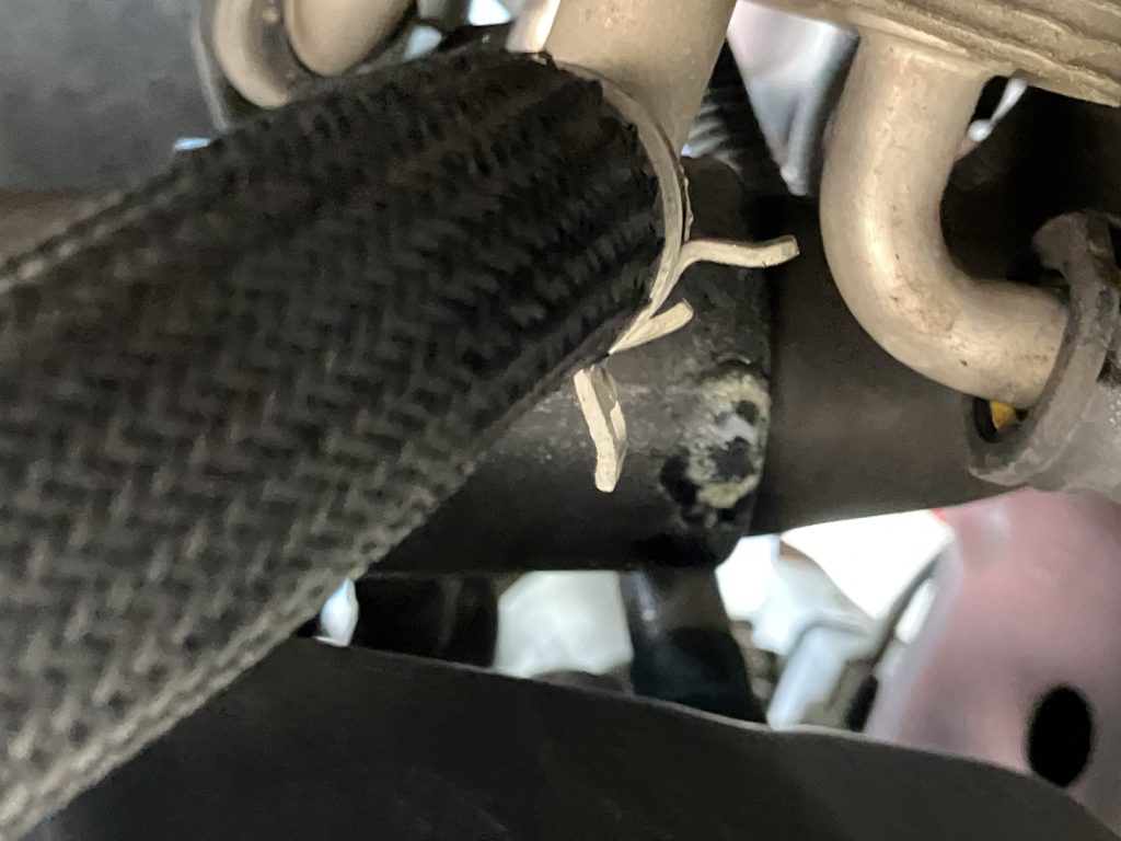 冷却水が漏れてしまった原因は、ラジエーターホース関連の経年劣化による切れでした。