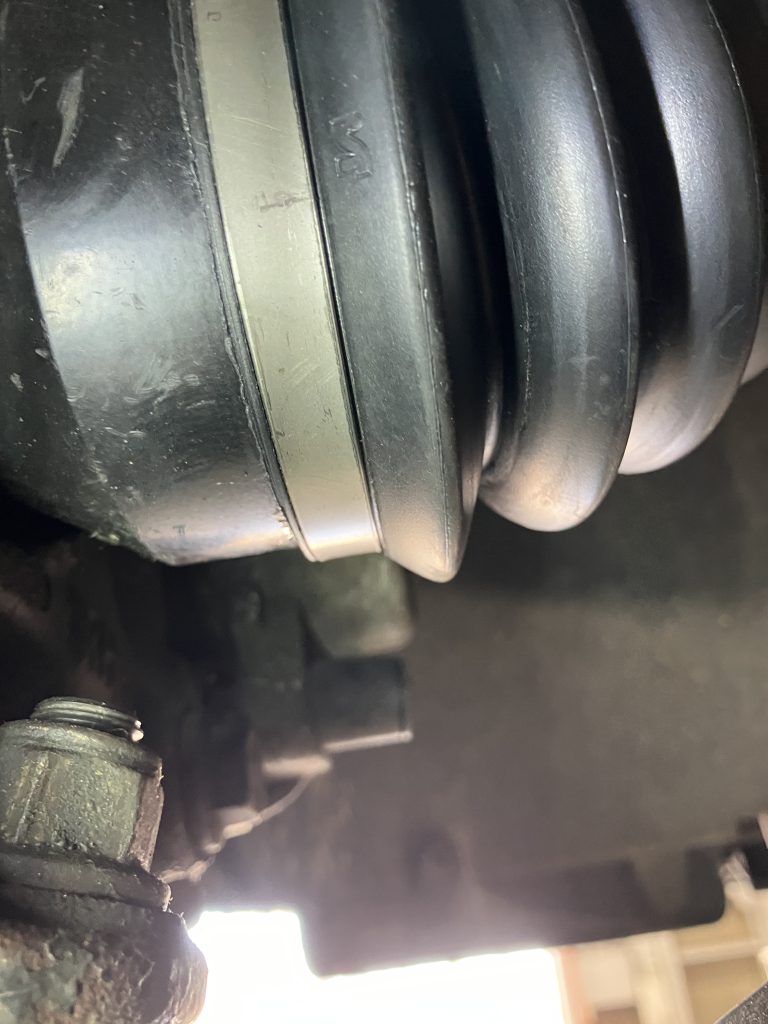 点検の結果、フロント左右のドライブシャフトブーツ締め箇所からのグリース漏れを確認しました。