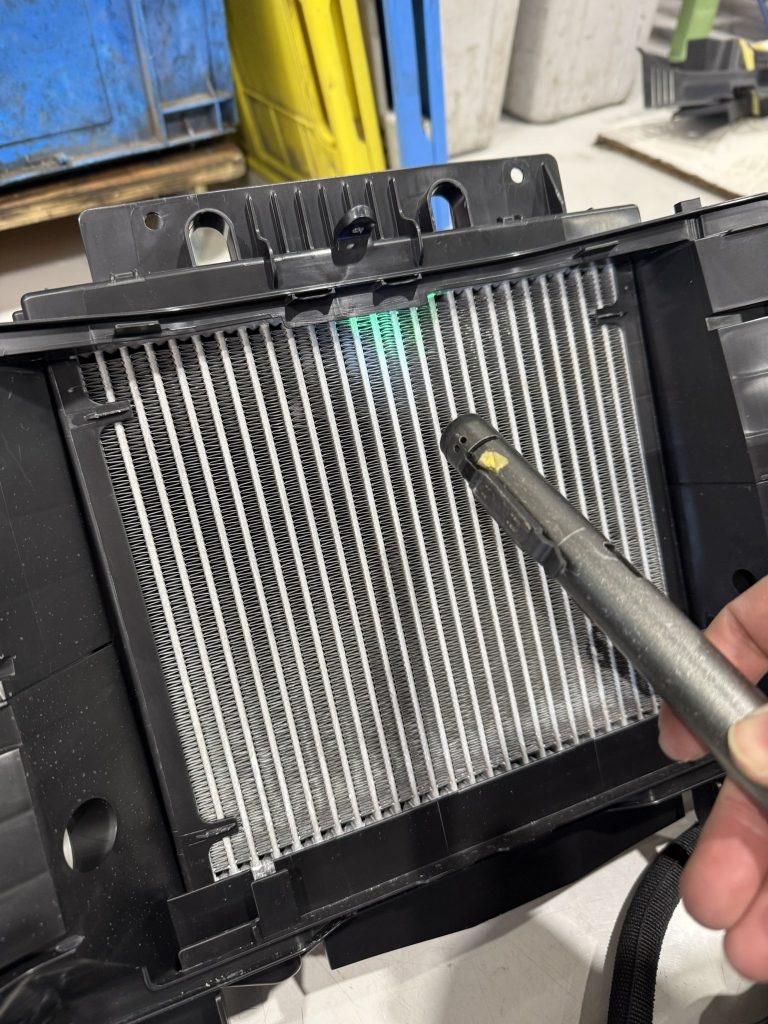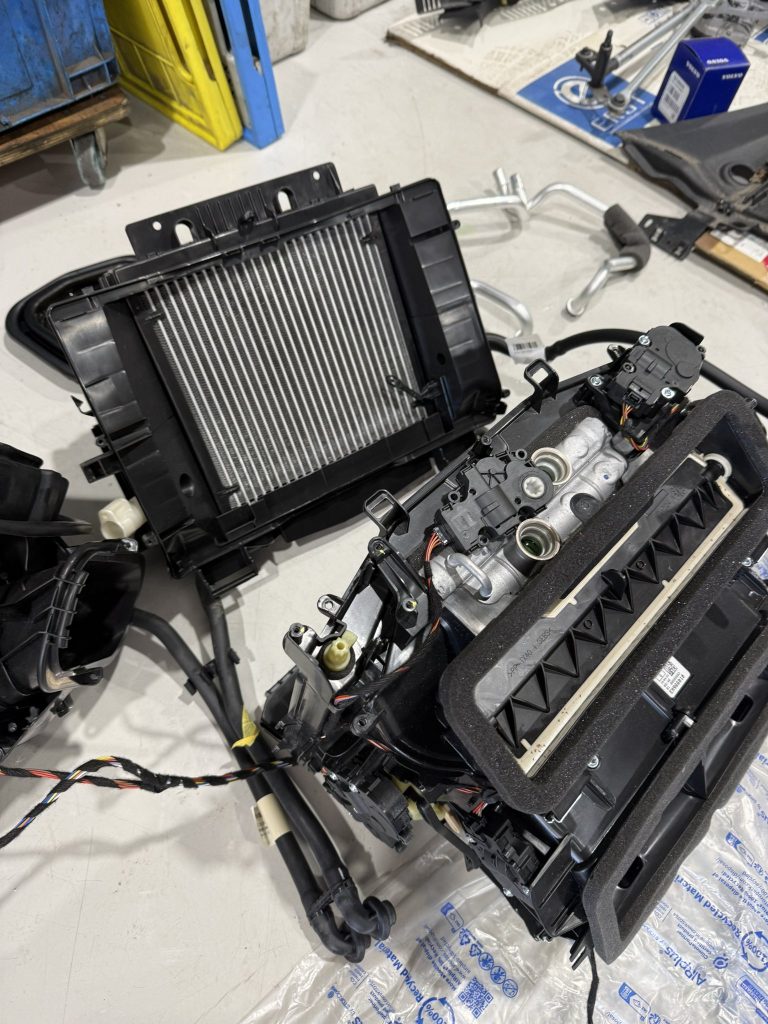 画像のようにエバポレーター自体は大きくはない部品ですが、ダッシュボードの奥深い場所にあるため、内装とエンジンルーム内の多くの部品を外す必要がある重整備となります。