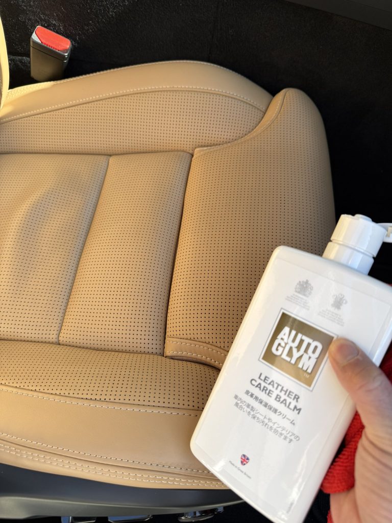 レザーケアバームを使用して、本革シートの保湿、汚れの防止を行って仕上がり完成です。