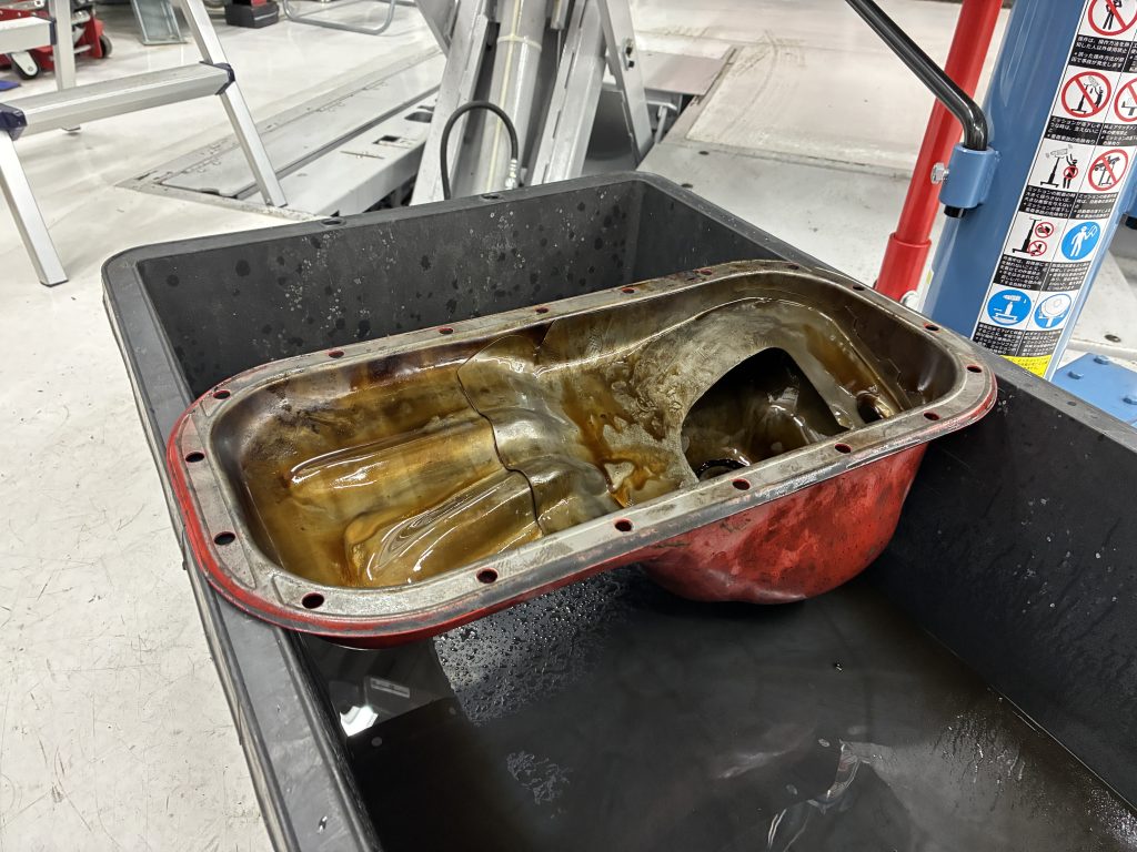 点検の結果、クランクシャフトフロントシール周辺およびオイルパン付近からのオイル漏れが確認されたため、