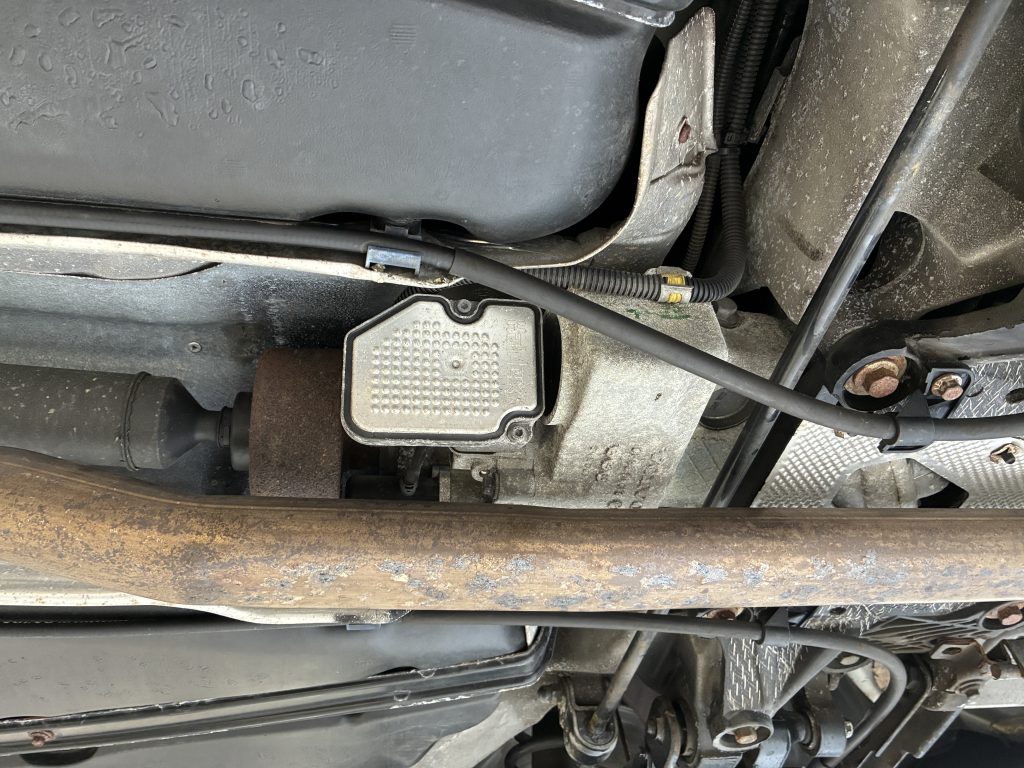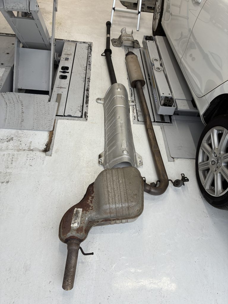 このモデルのハルデックスオイル交換は実は非常に手間がかかる作業となり、スペースを確保するためにエキゾーストマフラーとプロペラシャフトを一度取り外す必要があります。