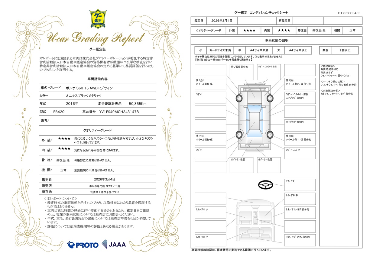 2016年式のボルボ S60 T6 AWD Rデザインが入庫しました。ボディカラーはオニキスブラックメタリックとなります。