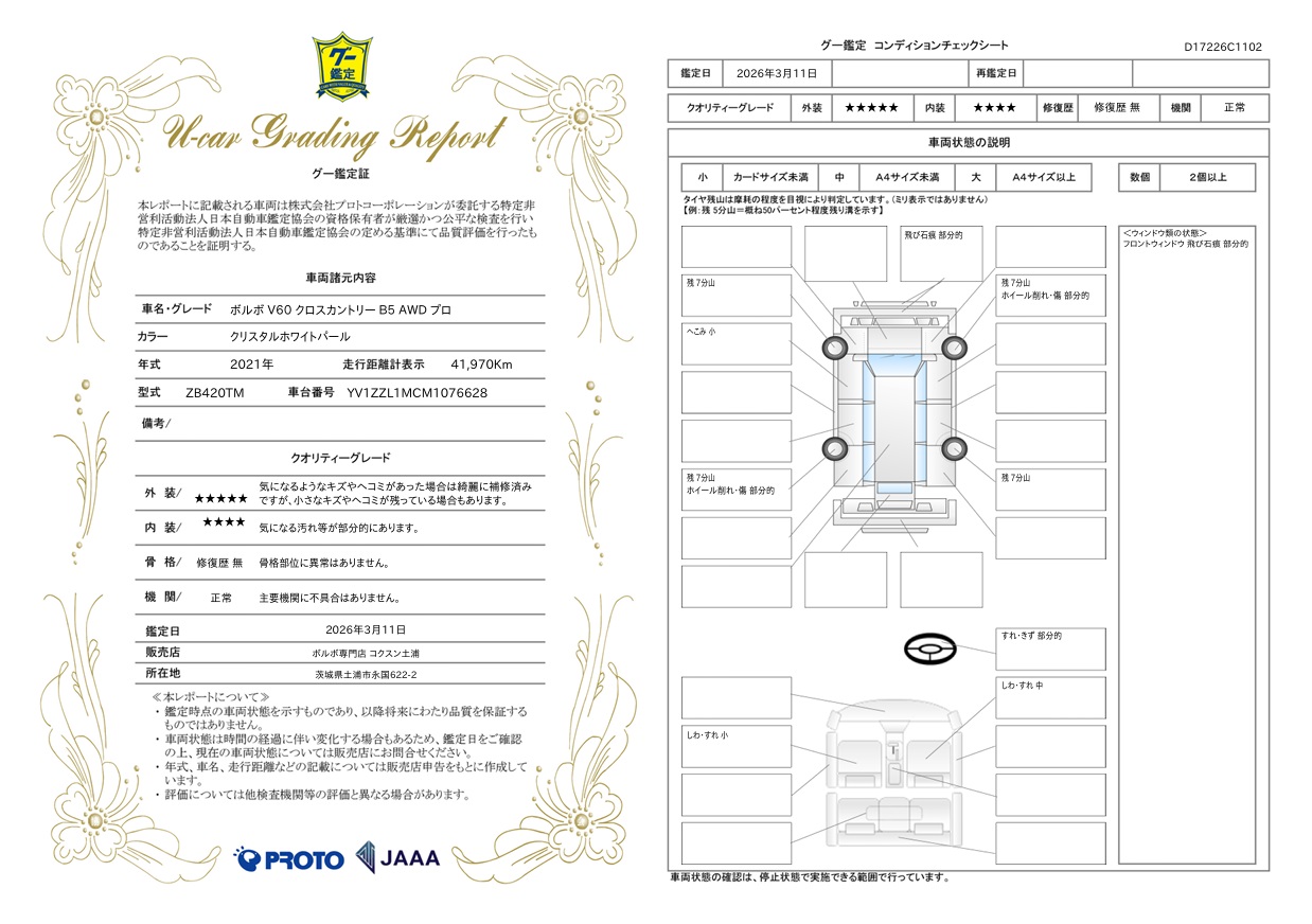 2021年式のボルボ V60 クロスカントリー B5 AWD プロが入庫しました。ボディカラーはクリスタルホワイトパールです。